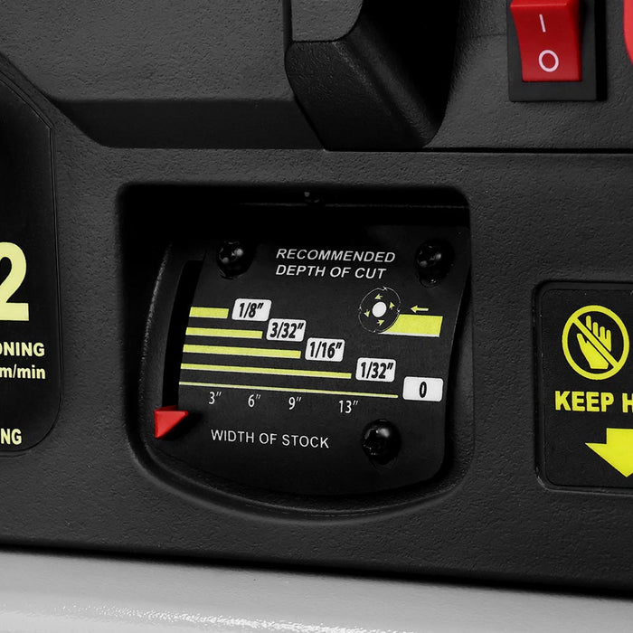 The thickness planer is equipped with a depth-of-cut gauge. Easy-to-read depth-of-cut gauge shows cut depth from 0 to 1/8", allowing users to know exactly how much material will be removed on each pass.