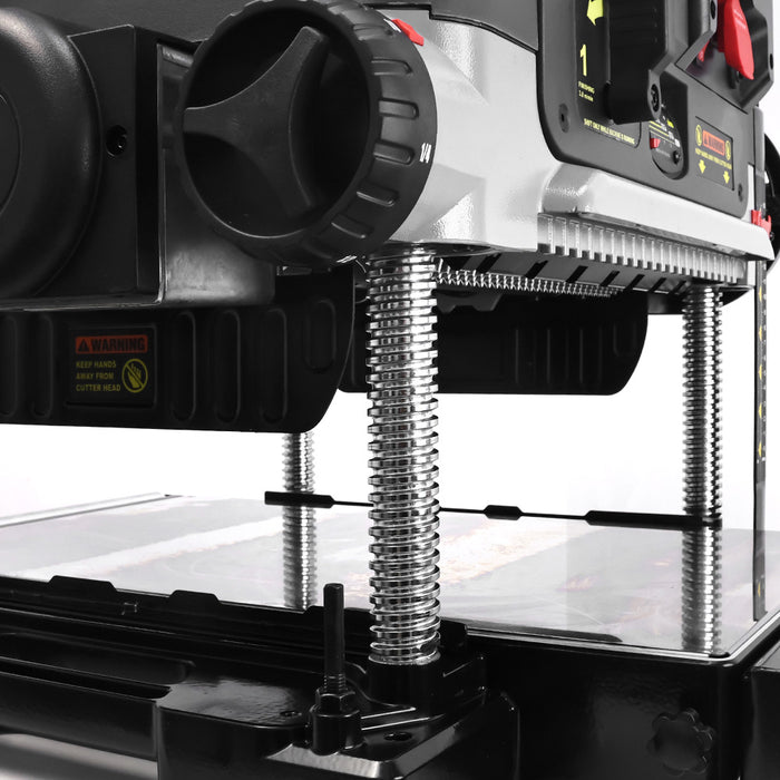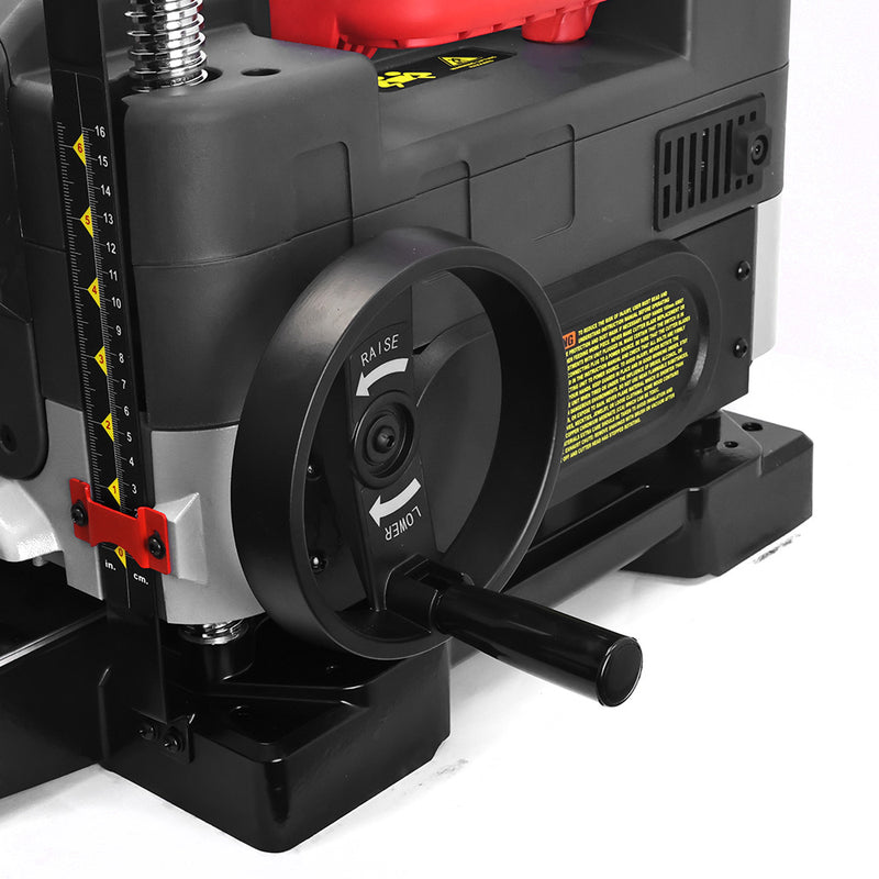 This 15A, 2.5HP (1800W) motor delivers high torque and stable power, turning the cutterhead at 8,700 RPM. It plans through dense hardwoods like oak and maple without being stuck and stops - even on 6" thick, 13" wide boards.The use of gear transmission offers higher transmission efficiency and a relatively smaller load on the motor, which can effectively extend the motor's lifespan.