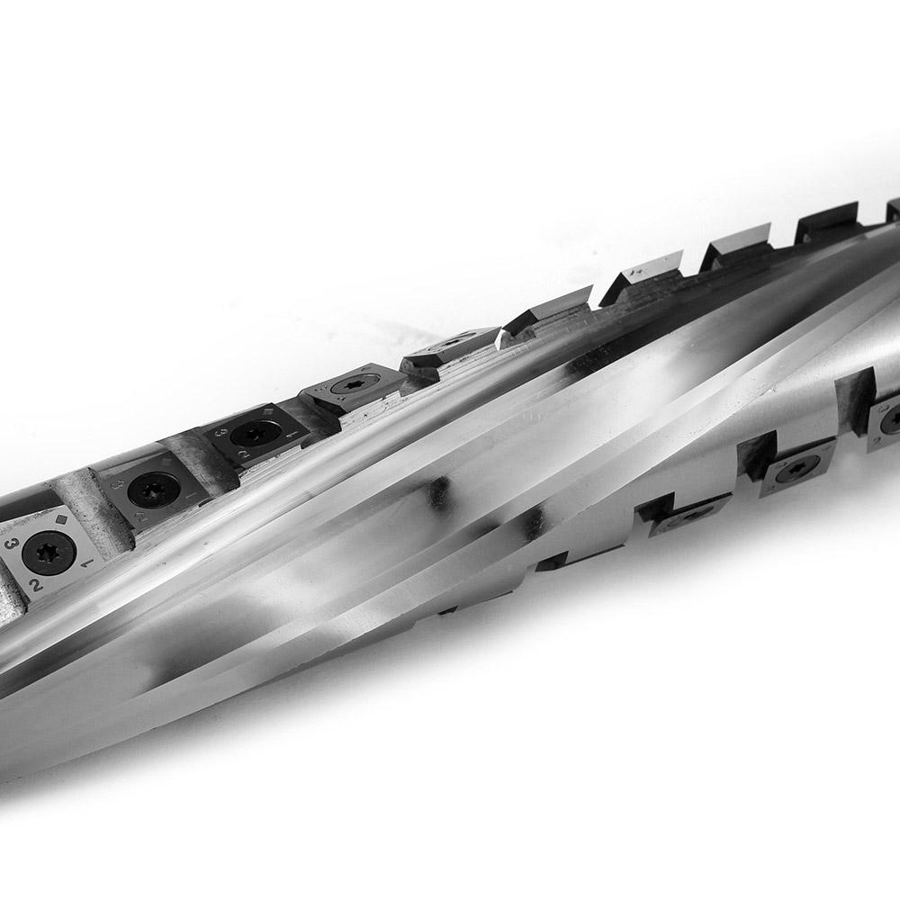 This spiral cutterblock features 2 cutting wings, offering perfect surfacing quality. Our spiral cutterheads are well manufactured by 5-axis CNC machines, resulting in excellent coaxiality. The tungsten carbide insert knives are made of 100% raw material, so compared with HSS knives, we provide you